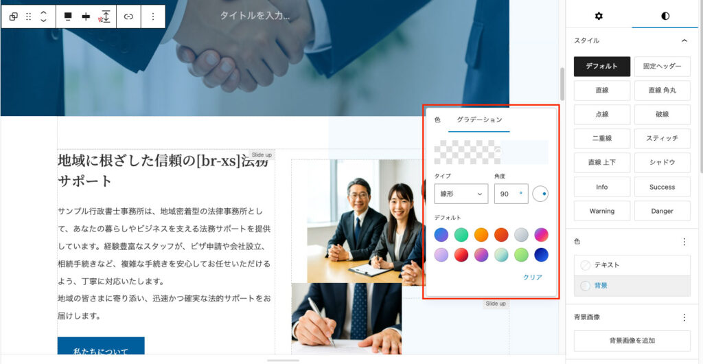 グラデーションの色を変更する場合は、親のグループブロックを選択して、右側のブロックの設定画面「スタイル」タブに切り替え、【色】>「背景」の「グラデーション」から変更してください。