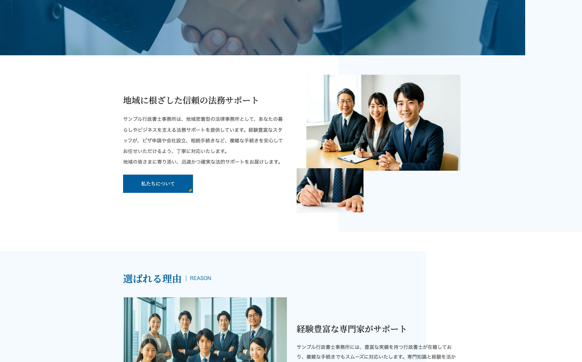 実在感と温かみのある構成で、敷居の高くなりがちな士業サイトを親しみやすく演出します。