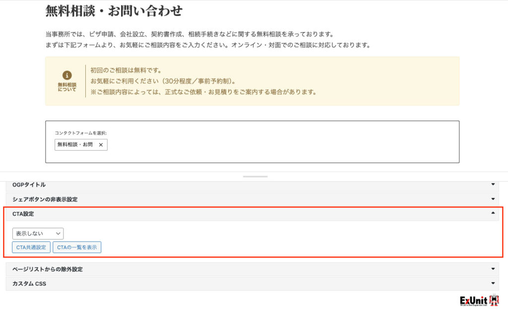 また、「無料相談・お問い合わせ」ページでは(同じお問い合わせページへのリンクになる為)、「CTA」を非表示にしています。編集画面下にある「CTA設定」のボックスにて表示設定が可能です。