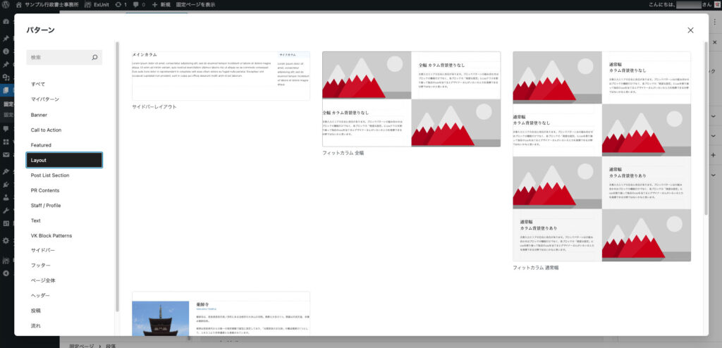 このように独自のブロックパターンを登録しておくと、新規作成時に登録しておいたブロックパターンを選択して作成できるので大変便利です。